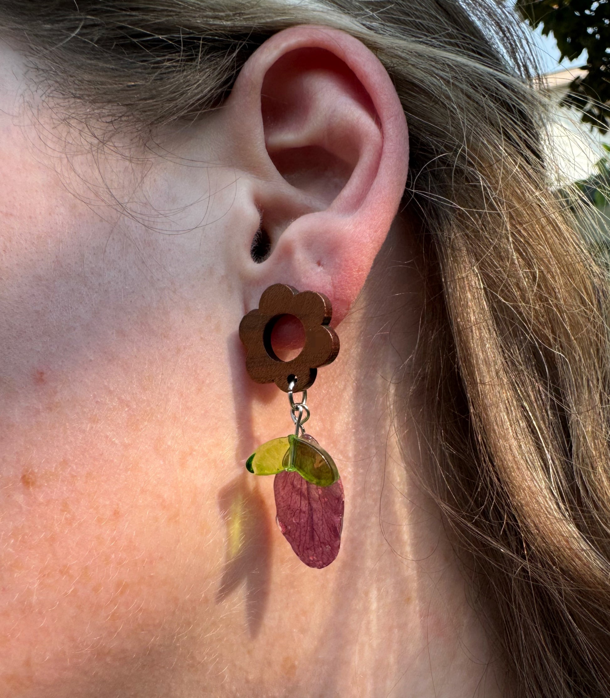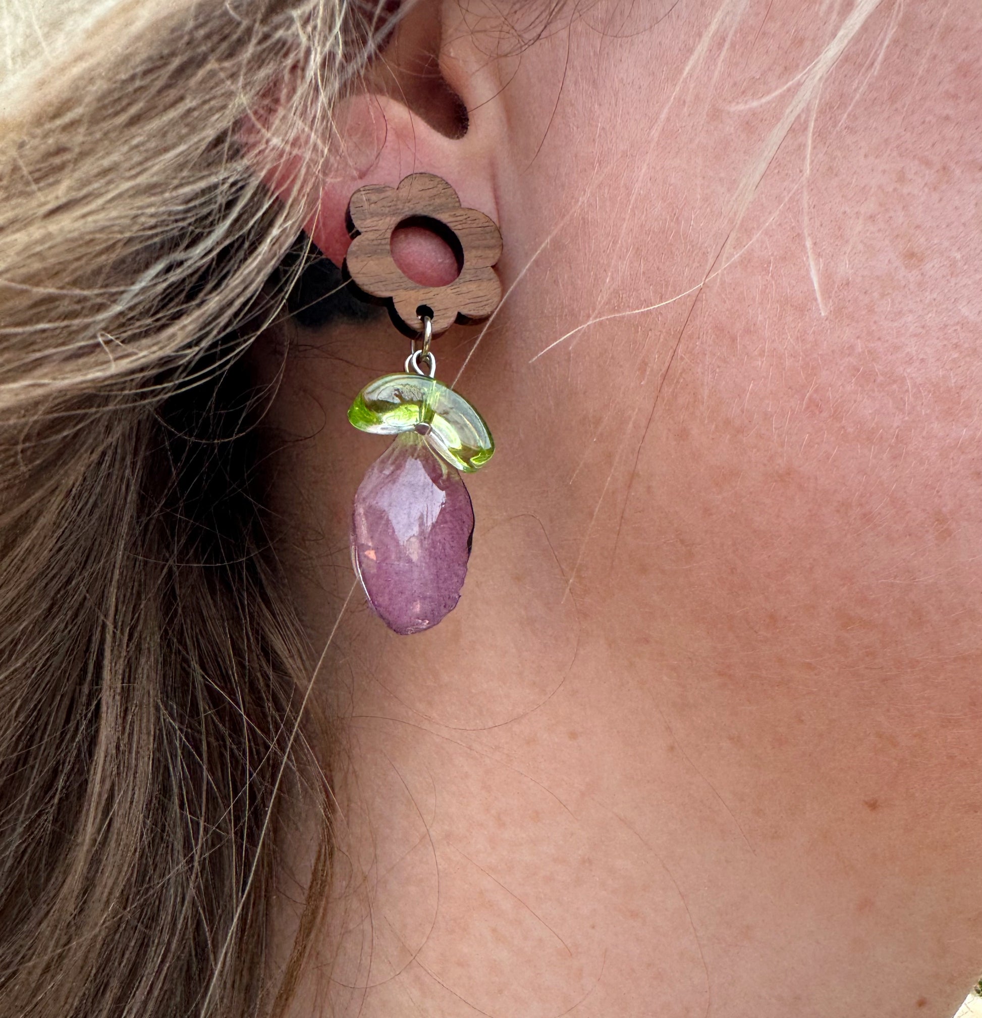 - This listing is for one set of preserved ornamental plum petal earrings in our wooden stud backed dangle style.